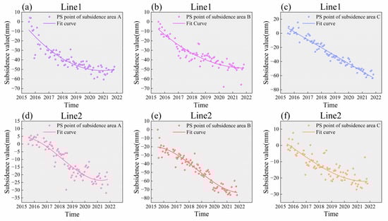 Typical PS points of subsidence trend in the subsidence area: (a) Typical PS point subsidence trend in subsidence area A of subway line 1; (b) Typical PS point subsidence trend in subsidence area B of subway line 1; (c) Typical PS point subsidence trend in subsidence area C of subway line 1; (d) Typical PS point subsidence trend in subsidence area A of subway line 2; (e) Typical PS point subsidence trend in subsidence area B of subway line 2; (f) Typical PS point subsidence trend in subsidence area C of subway line 2.