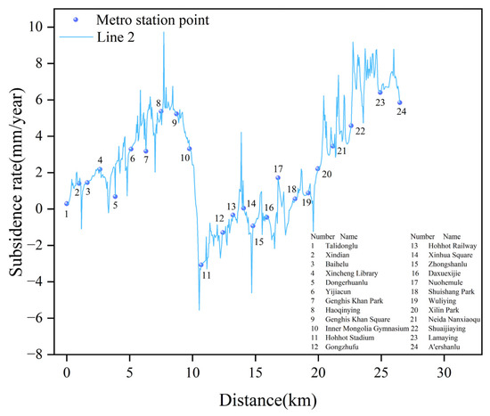 The PS point near the Hohhot City Stadium along Line 2 accelerated in 2017 and slowed after 2021. The shield tunneling section from Hohhot Stadium to Gongzhufu started in 2017 and was completed in 2019, which is consistent with the subsidence trend during subway construction. The settlement near Zhongshanlu Station of line 2 reached 70 mm. The settlement rate of PS points in this area was linear from 2017 to 2019 and slowed after 2020. The construction time of Zhongshanlu Station was from July 2017 to June 2019. Therefore, it is speculated that the settlement in this area was related to subway construction. There is evident subsidence along the section from Daxuexijie to Nuohemule on Line 2. The PS point in this area showed noticeable settlement within the construction zone, which gradually stabilized after the construction of the subway.