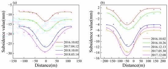 Another section, from Zhongshanlu to Xinhua Square of subway line 2, also experienced a significant settlement, as shown in Figure 10c. Following the same method used for the profile construction of Line 1, the time-series settlement information for the points along the profile line near Zhongshanlu was extracted, as shown in Figure 11b. The settlement trough gradually increased in magnitude from 2 October 2016, to 8 December 2017, from −5.9 mm to −10.1 mm. The maximum width of the settlement trough was 67 m, which gradually decreased after 30 May 2017. The Peck formula fitting parameters for the settlement trough are listed in Table 4.