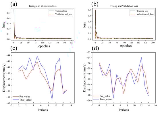 The data selected for the analysis were the time series of PS points located along subway line 1 between the Affiliated Hospital and Hugangdonglu stations. Owing to the different temporal variations in the PS points, each PS point is considered a feature, adopting a multi-input, single-output format, and finally predicting the time series of the selected PS points. The specific parameters of the model are shown in Table 5. Different model parameters were selected for both regions to achieve better training results after continuous experimentation. Therefore, in the affiliated hospital area, the first 71 periods of data were used as the training set, and the last 14 periods of data were used as the test set; in the Hugangdonglu area, the first 72 periods of data were used as the training set, and the last 13 periods of data were used as the test set. In addition, 20% of the data from both regions were selected as the validation set in the training set to observe the generalization ability of the model during the training process.