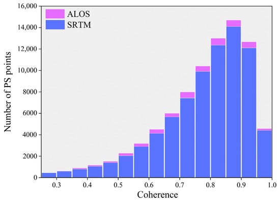 After co-registration, SAR images were used to remove the terrain phase using an external DEM. Differences in different external DEMs can lead to different terrain residuals in the differential interferogram [47], consequently affecting the initial phase accuracy of StaMPS-PS. Research showed that high-resolution external DEM can improve the density of PS points and enhance the accuracy of estimating the average deformation rate [35]. Therefore, the ALOS PALSAR DEM and SRTM-1 arc DEM were used as external DEMs to study the effects of two DEMs on the monitoring results of StaMPS-PS deformation based on Sentinel-1A images. Because of the difference in resolution between the ALOS PALSAR DEM and the SRTM-1 arc DEM, the latitude and longitude of the selected PS points can also differ, resulting in differences in PS point selection. Overall, there is no significant difference in the spatial distribution of PS points between them. When the ALOS PALSAR DEM was used as the external DEM, 83,819 PS points were selected, whereas when the SRTM-1 arc DEM was used, 83,327 PS points were selected. The number of PS points selected by ALOS was 492, more than that selected by SRTM. Figure 13 shows the number of PS points for the two external DEMs in each coherence interval. When coherence γ > 0.35, the number of PS points with the ALOS PALSAR DEM as the external DEM was greater than that of the SRTM-1 arc DEM, and in the high-coherence region (γ > 0.7), the number of PS points with ALOS was much higher than that of SRTM. The results show that the improvement in the external DEM resolution improves the coherence of the PS points of the StaMPS-PS technology based on the Sentinel-1 image.