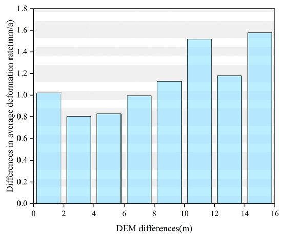 Section 4.1 showed deformation monitoring accuracy was higher when ALOS PALSAR DEM was used. To further investigate the relationship between the external DEM and deformation rate, the intersection of the PS points of the two types of DEM was statistically analyzed, and the differences in deformation rate between these common PS points were calculated. The mean differences in deformation rate for these common points were 0.07 mm/year, with a standard deviation of 1.33 mm/year. To analyze the influence of DEM differences on the deformation rate calculation results, the DEM differences were equally divided into eight intervals, and the mean deformation rate values of each interval were calculated and plotted in a histogram. As shown in Figure 14, as the DEM differences increased, the mean deformation rate differences also increased, indicating that the larger the DEM residuals, the greater the impact on the mean deformation rate.