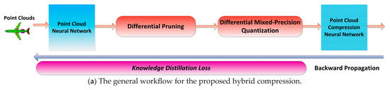 This paper proposed a novel hybrid compression method with differential mixed-bits and mixed-sparsity search and knowledge distillation techniques. To account for the specialty of the point cloud deep model, feature-based knowledge distillation was proposed to solve the pooled feature’s degradation problem. To overcome the uniform quantization bit problem, this hybrid compression method considered the different layer’s different needs for bit number. Experiments, including ablation and comparative and extended experiments, validated the efficiency of the proposed method, and the complexity analysis objectively evaluated its advantages and disadvantages.