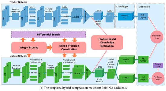 The flowchart of the proposed hybrid compression framework is shown in Figure 1. Figure 1a provides a general workflow. When inputting the point clouds in the deep model, the full precision model is pruned and then quantized with mixed bit-width differentially. During backward propagation, pooled feature-based distillation loss is added. It mainly includes three subsections: weight pruning, mixed-precision quantization, and knowledge distillation. The core idea of this design is to overcome the limitation of uniform quantization using the same bit-width for different layers; thus, this paper adopted the mode of mixed bit-width quantization and further introduced pruning to optimize additional memory brought overhead by the mixed bit-width. Feature-based knowledge distillation was used to alleviate the performance degradation caused by the point cloud pooling aggregation. Figure 1b is the proposed hybrid compression model on a typical PointNet backbone. Weight pruning was performed before mixed bit-width quantization, while activation directly underwent mixed bit-width quantization. Knowledge distillation was mainly implemented by the feature distillation method and was further optimized in two stages using the response-based distillation method.