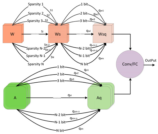 The optimal bit/sparsity search process for convolution/fully-connected layer is shown in Figure 2. The compression for weights uses a kind of cascading type of ‘pruning–quantization’, while the activation implements mixed quantization. The overall network is fully differentiable and could find optimal bit/sparsity allocation from a given discrete and large search space without proxies. To further speed up the search process, layer-wise pruning or quantization was implemented.
