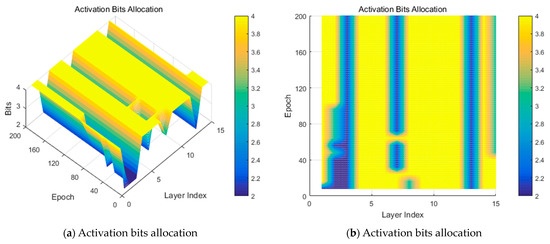 To validate the efficiency of relaxed mixed quantization, compression with only quantization was implemented with different complexity factors. Table 2 illustrates the quantization ablation results with a complexity factor ranging from 1 × 10−1 to 1 × 10−9. It can be concluded that, as the complexity factor’s value decreases, the number of bits roughly increases. This indicates that, with a larger regularization of the complexity, the bit width becomes smaller, and the bit width becomes larger if the regularization of complexity is smaller. Figure 4 presents the bit variation during training for both weights and activation. It indicates that the activation needs larger bits than weights (i.e., with a larger yellow area) and activation is much more sensitive than the weights.