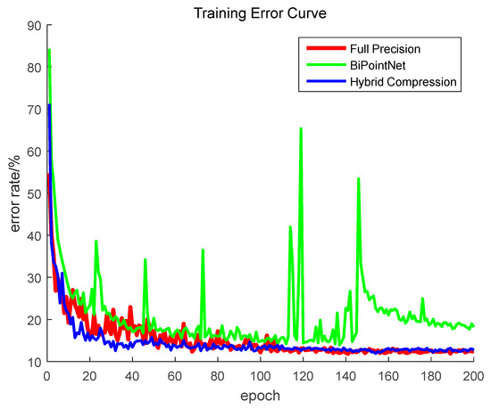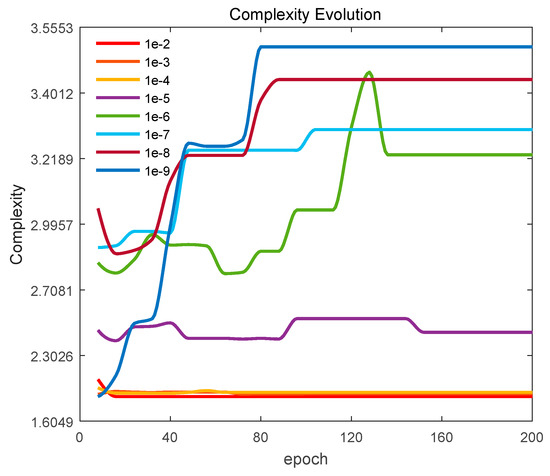 Complexity regularization during training could balance the accuracy and memory size. Figure 9 presents the complexity evolution with increasing epochs. It can be concluded that, regardless of any complexity factor value, the complexity approximately approaches a relatively stable status with a larger epoch number. When the complexity factor is smaller than 1 × 10−5, the smaller the value, the faster the complexity reaches a steady state. As the complexity factor value decreases, the complexity value of the steady state gradually increases, which indicates the regularization of the complexity term decreases. When the complexity factor is greater than 1 × 10−4, the larger regularization causes the model complexity to change a little and maintain a lower state with the increase in epochs.