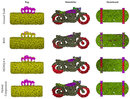 Figure 6 shows the part-segmentation results for three samples. The segmentation errors are concentrated on the handle of handbag. For BNN, it is almost entirely wrongly segmented, while for HGWQ and the proposed methodology, the situations are much better. However, compared to HGWQ, the proposed method has much less noise on the handle. The situation is similar to the cases of the motorbike and skateboard. For example, the segmentation of the fuel tank and headlamp for the motorbike and the board edge for the skateboard are much better in the proposed method.