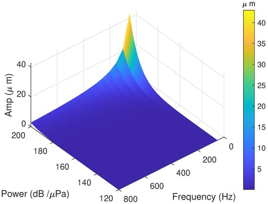 where is the sound-radiated power, is the emission directivity coefficient. Generally, the radiated sound power of marine sonar is hundreds to thousands of watts, and the is 10 to 30 dB, so the SPL is approximately 210∼240 dB/. Considering a 500 m propagation attenuation as a spherical wave (propagation attenuation can be approximately estimated by , where d is the water depth in meters), the incident SPL at the water–air interface is approximately 120∼200 dB/. Figure 2 shows the amplitude of the sound-induced micro-vibrations with different incident SPLs and frequencies. It is shown that the amplitudes are very small (only a few hundred nanometers for 200 Hz sound with incident SPL 150 dB/).