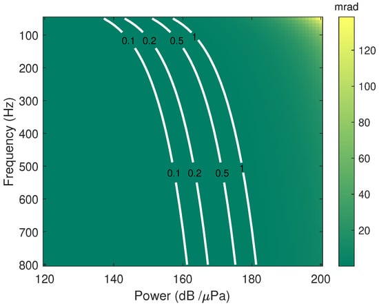 Phase changes with different SPLs and frequencies for a 77 GHz mmWave radar. The white curve is the contour that has a constant phase change. For example, the curve labeled 1 represents a phase change of 1 mrad.