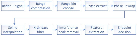 The FMCW radar measures the reflection after a fast Fourier transform (FFT)-based range compression. Generally, the highest reflection power range bin is chosen to extract the phase of each chirp. The extracted phase is wrapped due to the surface waves. The wrapped phase needs an unwrapping process before the next process. Spline interpolation is used to fill the missing data, if necessary. Then, a high-pass filter is applied to eliminate the low-frequency modulation of water surface waves. The surface waves always induce spikes which degrade communication performance significantly and are difficult to filter out. After this processing, the signal feature can be extracted from the filtered phase signal. Finally, the WSAW endpoint can be obtained by a decision method. Signal processing steps are presented in Figure 5.