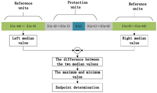 Figure 6 shows the decision method architecture with the length of reference unit of 40 and the length of protection unit of 4. Figure 7 gives the detailed signal processing flow diagrams of the decision method based on the extracted feature signal. The two-parameters method can adaptively identify the step change of the extracted feature signal.