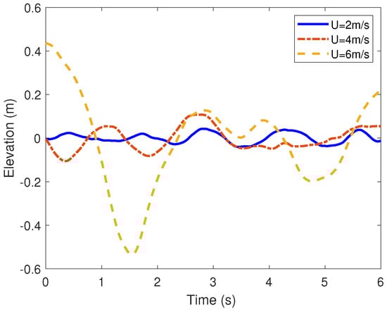 One-dimensional (1D) ocean elevation time series at a position retrieved under different wind speeds.