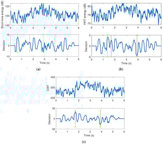 Figure 10 shows the extracted features and endpoint decision results obtained by the STE, HHT, and CWT methods. The red lines show the actual endpoint location, and the green star lines show the determined endpoint location. For the same phase data shown in Figure 9b, the CWT method can get the best endpoint decision result, while the short-time energy method cannot give the right endpoint location. It is worth noting that both HHT and CWT methods have applied the frequency-domain energy distribution, which effectively improves the detection accuracy.