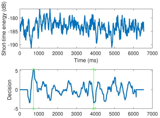 Endpoint detection results by short-time energy algorithm, the green star lines show the determined endpoint location.