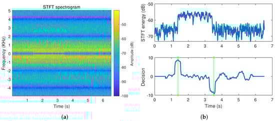 (a) STFT spectrogram; (b) Endpoint detection results by the STFT spectrogram.