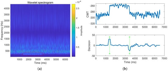 (a) CWT spectrogram; (b) Endpoint detection results from the CWT spectrogram.