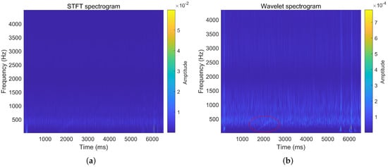 Figure 19b presents the CWT spectrogram. The spectrogram is also obtained using the analytic Morse wavelet with a symmetry parameter (gamma) equal to 3 and the time-bandwidth product equal to 60. The minimum and maximum scales are determined automatically based on the energy spread of the wavelet in frequency and time. In the spectrogram, the oblique line at the time around 2 s represents the time-frequency distribution of the LFM signal. This oblique line is relatively clear and longer than that in the STFT spectrogram. The STFT technique suffers from the fixed time and frequency resolution due to the fixed window length used in the analysis, limiting its applications in practice. The frequency resolutions of the CWT spectrogram are variable, and about 8 Hz around 100 Hz, and 50 Hz around 1000 Hz. When the signal is less than 1 kHz, CWT has a finer frequency resolution than the STFT. Therefore, CWT has a stronger time-frequency analysis ability of the WSAW signal than the STFT.