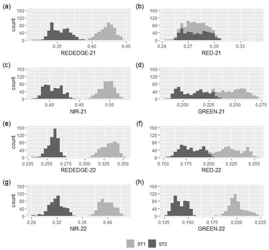 Histogram of each multispectral band of the soil surface of nearby experimental vines (ST1 and ST2) in the vineyard (Toledo, Spain) based on 500 pixels for each site. The first two rows correspond to 2021 (−21), and the rest correspond to 2022 (−22). The bands are red edge (a,e); red (b,f); NIR (c,g); and green (d,h).
