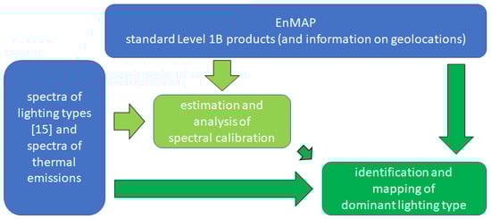 Nocturnal optical remote sensing in the visible and near-infrared (VIS/NIR) and shortwave infrared (SWIR) ranges of the electromagnetic spectrum is largely challenging compared to its daytime counterpart and nighttime remote sensing in the thermal infrared. This is even more prominent when considering spectrally resolved data and ground resolutions of approximately . Even if there is a large gap in terms of the number and diversity of available missions and products, there exists a demand for such nighttime products. The interest in such products is growing as evident from the increasing number of applications [1]. These include the monitoring of human settlements and urban dynamics, the estimation of demographic and socioeconomic information, light pollution and its influence on ecosystems, human health and astronomical observations, energy consumption and demands, detection of gas flares, active volcanoes and forest fires, and natural disaster assessment and the evaluation of political crises and wars [2,3]. Most of these applications are derived from data linked to artificial lights that mainly emit in the VIS/NIR, but also in the SWIR. A stronger focus on optical nighttime remote sensing is, therefore, well-founded. One example from the domain of socioeconomics is that the lighting type is a much stronger indicator of economic growth than merely the intensity of light, as highlighted in most studies [4]. This is further accentuated by the ongoing change in illumination technologies toward LED (light-emitting diode). As economic growth is indirectly related to greenhouse gas emissions from all sectors [5], observations of artificial light and energy consumption estimates complement existing missions on trace gases [6]. Furthermore, many other past, present, and planned missions provide information regarding how greenhouse gas emissions affect the global environment.