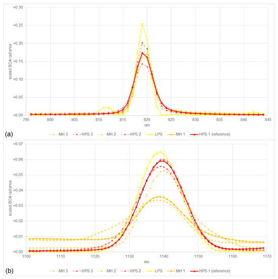 Within this study, we consider the spectral features of high-pressure sodium (HPS), metal halide (MH), and low-pressure sodium (LPS) lamps. The spectra of HPS and MH have strong peaks at 819 nm and 1139 nm (which are typically the strongest in VIS/NIR and SWIR). The spectrum of LPS has a medium peak at 819 nm and a low peak at 1139 nm. Furthermore, the signals are higher in VIS/NIR than in SWIR. These spectra were measured by [15] and the sums of the signals normalized to 1 are illustrated in Figure 4. Other lighting types measured by [15] do not have strong and narrow emissions in this region, as illustrated in Section 4.2. For VIS/NIR, we do not expect any other strong influences. For SWIR, we expect some influences based on stronger thermal emissions and stronger atmospheric absorption effects, resulting in higher uncertainties.