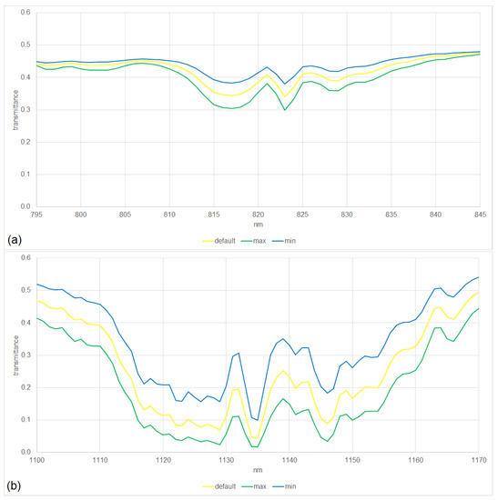 We consider a standard atmosphere (A3), namely, an urban mid-latitude summer atmosphere at nadir with a default water vapor of 3635.9 atm-cm [26] because more detailed information is typically absent, e.g., not stated in the metadata of the product. By accounting for the atmosphere, we consider TOA (top-of-atmosphere) radiance instead of BOA (bottom-of-atmosphere) radiance of the reference spectrum. Because the dynamics of the atmosphere are limited in the considered ranges, namely, the change in the atmosphere in the EnMAP observation is limited, the differences in atmospheric transmission between a maximal, a default, and a minimal water vapor are essentially constant across these ranges, as illustrated in Figure 5; since other atmospheric parameters exhibit limited non-constant effects, we do not expect major influences on the evaluation of the spectral calibration in this context.