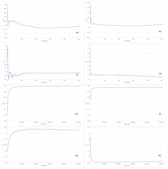 Based on these results, particularly the maximum and sum scenarios, we consider the image spectra ordered from high signals to low signals with respect to the considered range, namely, a mixture of the maximum and sum. To be more precise, we consider the spectrum resulting as the sum of the image spectra of the ith highest signals for 1,024,000. We already analyzed and in the maximum and sum paragraphs. Let be the correspondingly observed error and let nm be the observed shift. We expect larger changes in the error (and shift) if i is small, due to the larger influence of random effects for single pixels, as illustrated in Figure 8 (top). We also expect smaller changes in the error (and shift) if i is large, due to the smaller influence of an extra pixel, which has, at most, the same signal influencing the sum as the prior considered pixel, as illustrated in Figure 8 (bottom). We intend to identify the spectrum with a minimal error , but for a large enough i, so that it is not strongly affected by outliers. Future research may consider outliers and radiometric uncertainties in a more sophisticated way.