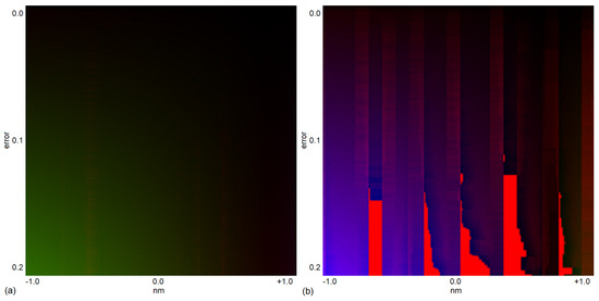 Influence of noise on the estimation for VIS/NIR (left; (a)) and SWIR (right; (b)). The differences of the observed shifts compared to the shifts of the related noisy reference spectra given on the x-axis for the observed errors given on the y-axis (see the text for full description). Changes from green to olive and blue to purple illustrate the maximal variety in shifts of the noisy reference spectra resulting in the observed errors and shifts. A full green hue is related to a negative shift of nm and a full blue hue to a positive shift of nm. A full red color illustrates the non-existence of shifts of noisy reference spectra, resulting in the observed errors and shifts.