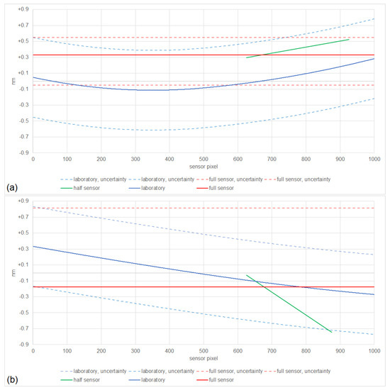 Per-pixel center wavelengths based on laboratory calibrations, estimated considering the full sensor, and the best-fitted two of four parts, namely, half of the sensor for VIS/NIR (top; (a)) and SWIR (bottom; (b)).