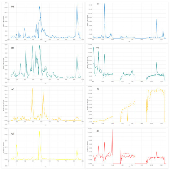 Observed spectra (solid) and reference spectra by [15] (dashed) for the eight considered image pixels, HPS (a,b), MH (c,d), FL (e), low temperature (f), LPS (g), high temperature (h), for VIS/NIR (left; (a,c,e,g)) and SWIR (right; (b,d,f,h)); the sum of the signals normalized to 1.