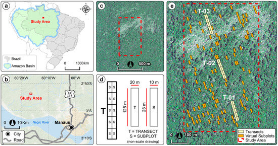 Windthrown forest located near Manaus, Central Amazon, Brazil (a,b), and inventory and virtual plots used to quantify tree mortality (c–e). Subfigures (c,e) are an RGB-composition from WorldView 2 image from 27 July 2016.