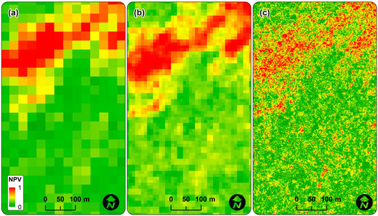 Cuts of selected NPVnorm images obtained from Spectral Mixture Analysis. (a) Landsat 8; (b) Sentinel 2; (c) WorldView 2.