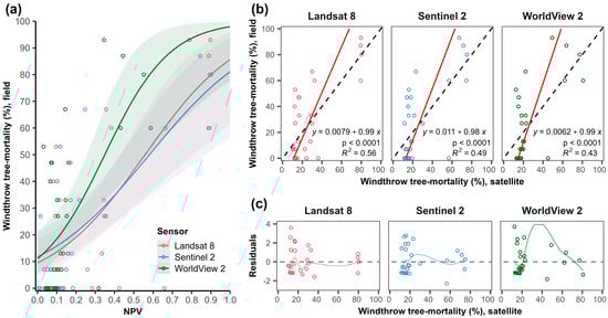 GLM models describing the relationship between windthrow tree-mortality measured in the field and estimated using remote sensing data. (a) Functions describing the relationship between NPV and windthrow tree-mortality (%) measured in the field; (b) Linear models describing the relationship between windthrow tree-mortality measured in the field and estimated using remote sensing. The black dotted and red lines are the 1:1 line (perfect linear relationship) and the actual relationship between observed and estimated values, respectively; (c) Symmetry of the distribution of residuals in relation to windthrow tree-mortality values estimated using remote sensing.