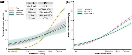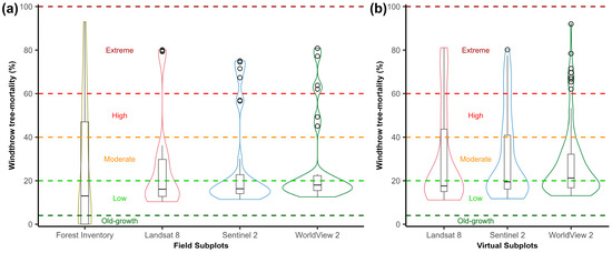 All satellites produced consistent estimates of windthrow tree-mortality from moderate to high disturbance severity (i.e., 25% to 42% of windthrow tree-mortality). Remote estimates overestimated field measurements by 5–10% from old-growth forest to moderate windthrow severity. From moderate to extreme windthrow severity, we found the opposite pattern—i.e., 10–15% underestimation (Figure 5a). Remote estimates of tree mortality for our virtual subplots covering a wider disturbance gradient were similar from low to moderate windthrow tree-mortality. From moderate to extreme windthrow tree-mortality, Landsat 8 and Sentinel 2 yielded comparable values, which were also different from those obtained from WorldView 2 (Figure 5b). Although with greater associated uncertainties at specific ranges of tree mortality (low to moderate and high to extreme severity), Landsat 8 and Sentinel 2 captured a relatively higher proportion of the existing variation of windthrow tree mortality over a wider disturbance gradient.