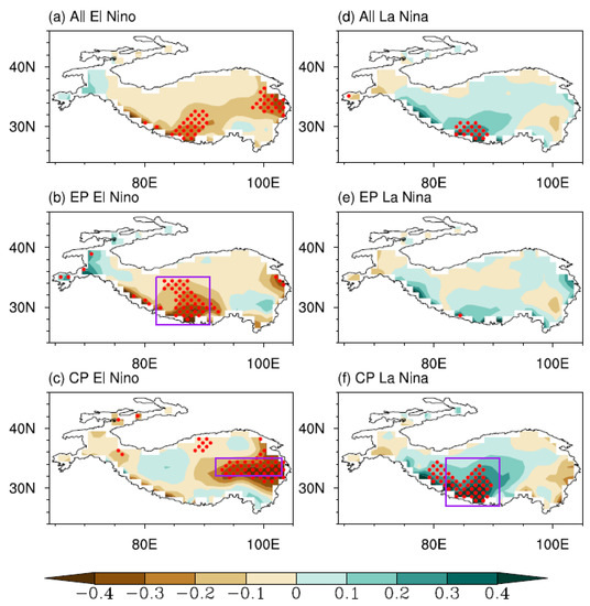 (2) SWTP summer precipitation significantly decreases during the EP El Niño but increases during the CP La Niña, while CETP summer precipitation decreases intensely during the CP El Niño. No significant anomaly occurs during the EP La Niña.