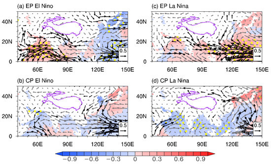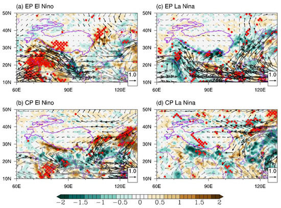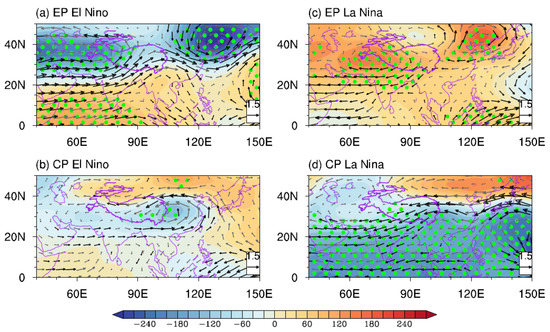 How do these distinct TP summer precipitation anomalies form during different types of developing ENSOs? On an interannual timescale, vertical motion and large-scale moisture transport are crucial factors controlling TP summer precipitation variation [37]. Figure 3 illustrates anomalous summer upper-tropospheric circulation during different types of ENSOs. During the EP El Niño, a pair of cyclonic circulation anomalies characterize the subtropical upper troposphere. These anomalies are located to the west of the TP and over northern China, respectively, and are associated with evident negative geopotential anomalies (Figure 3a). These cyclonic circulation anomalies are equivalent-barotropic, with cyclonic circulation anomalies occurring at the low level (Figure 4a). These two equivalent-barotropic cyclonic circulation anomalies relate the ISM to the EASM, referred to as the ISM-EASM teleconnection [34,35]. Meanwhile, positive geopotential anomalies exist over the northern Indian Ocean and western North Pacific regions. These low-latitude anomalies are the Kelvin and Rossby wave responses directly induced by the enhanced convection in the tropical Pacific associated with El Niño [32]. In this case, significant westerly wind anomalies occur to the south of the two cyclonic circulation anomalies, crossing the SWTP (Figure 3a). This anomaly pattern suggests a southward-shifted SAH and a subtropical westerly jet that cause descending motion anomalies over the SWTP, thus decreasing rainfall [24,25,26,27].