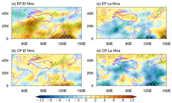 Composites of JJAS-mean 200-hPa geopotential (shading, unit: m2·s−2) and wind anomalies (vectors, unit: m·s−1) for different types of ENSO events. Green dots indicate geopotential anomalies statistically significant at the 90% confidence level. Dark-colored vectors denote the wind anomalies whose zonal or meridional components are significant at the 90% confidence level.