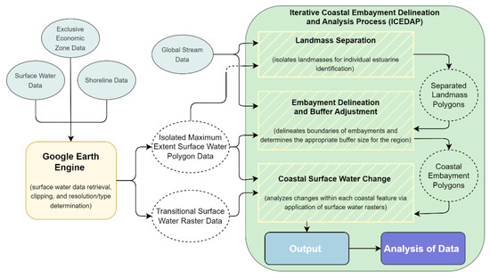The coastal embayment delineation and analysis process consists of three individual sub-tools: (1) landmass separation and embayment delineation, (2) buffer adjustment, and (3) coastal surface water change analysis. Together, these create a semi-automated process capable of delineating the extent of embayments for a singular region and its respective landmasses, via the maximum extent of surface water and an adapted coastline generalization process. These extent features are used to create accurate masks of surface water changes within embayed coastal waters.