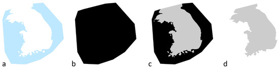 A representation of the landmass separation process. (a) Raw maximum-extent surface water data from the GSWD [33] (blue area). (b) A bounding polygon is formed around the extent of the raw surface water data (black area). (c) The raw surface water data (black area) is erased from the bounding polygon. leaving only the landmasses remaining (gray area). (d) The landmasses are separated into individual components for processing (gray area).