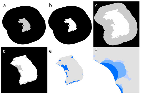 A simplified representation of the buffer series application and embayment delineation. (a) A 1 km buffer and subsequent 250 km buffer (black area) is applied to the landmass polygon (gray area). (b) The landmass is erased from the center of the buffered polygon to form an inverse version of the landmass (black area). (c) A negative buffer from the geometric series (black area) is applied to the inverse landmass (gray area). (d) A positive buffer (black area) of the same value is applied to the negatively buffered polygon (gray area). (e) The positive buffer is erased from the original inverse landmass (the result of part (b)) to form a set of embayment polygons for the applied buffer size (blue area). (f) This process can be repeated for all buffer sizes defined by the user. Example embayments for the 32 (light blue), 64 (moderate blue), and 128 km (dark blue) buffers are shown.
