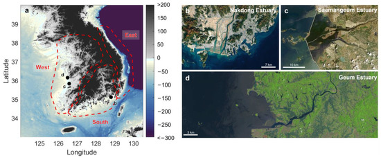 (a) Study map of South Korea showing elevation and bathymetry information of the peninsula. Elevation is based on SRTM15+ [44]. The red dashed line shows the three regions: the west coast (from the North Korean border to Songho-Ri), the south coast (from Songho-Ri to Busan), and the east coast (from Busan to the North Korean border). Aerial image of (b) Nakdong Estuary in 2017 (https://earthobservatory.nasa.gov/images/92703/decades-of-growth-at-port-of-busan, accessed on 1 March 2023) and (c) Saemangeum Estuary in 2018 (https://earth.esa.int/web/earth-watching/image-of-the-week/content/-/article/saemangeum-south-korea/index.html, accessed on 1 March 2023) showing large-scale urbanization and land reclamation within the embayment. (d) Geum estuary (https://earthexplorer.usgs.gov/, accessed on 1 March 2023).
