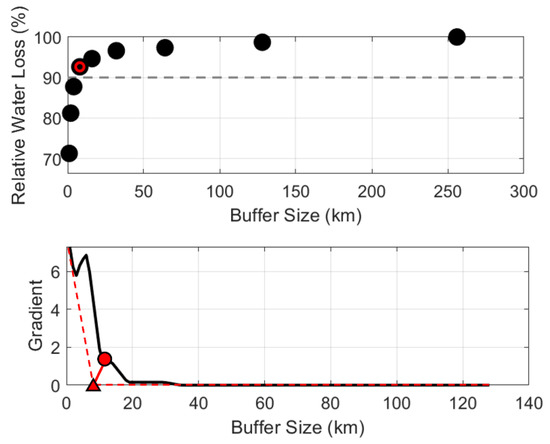 Previous work defined the estuary mouth as the transition point from river to coastal embayment [49,50], whereas other work commonly places the estuary mouth at the bay entrance and therefore includes portions of the bay farther offshore [51]. Here, we used a breakpoint analysis to determine which buffer size most adequately represents the seaward extent of our embayments while also capturing the majority of coastal change. We compared relative surface water loss and gain (i.e., relative to the total surface water loss/gain in the 256 km buffer) to changes in buffer size for each embayment, and defined the breakpoint as the point closest to the intersection between the minimum and maximum derivative. Here, we first interpolated and smoothed relative surface water loss and gain for each embayment and buffer size and used MATLAB’s gradient function to create a collection of vectors pointing in the direction of increasing water loss or gain. We then identified the buffer size closest to the intersection between the gentlest gradient/slope (i.e., generally between buffer sizes 32–256 km) and the steepest gradient/slope (i.e., generally between buffer sizes 1–2 km). We then calculated the mean, mode, and median values for all breakpoints in order to identify a common breakpoint across all South Korean embayments (Figure 5).