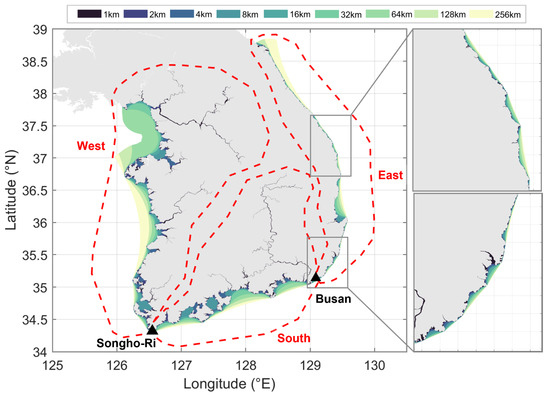 Embayments along the South Korean coast based on different buffer sizes. The red dashed line shows the three regions: the west coast (from the North Korean border to Songho-Ri (black triangle)), the south coast (from Songho-Ri to Busan (black triangle)), and the east coast (from Busan to the North Korean border).