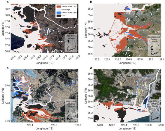 Examples of coastal surface water gain and loss between 1984 and 2021 in the coastal embayments of the Han River, Incheon (a); Saemangeum Estuary, Gunsan (b); Yeongsan Estuary, Mokpo (c); Nakdong Estuary, Busan (d), which are known to have undergone tremendous coastal change following port development and large-scale land reclamation projects [6,41,49,50,51,52]. Basemap is based on Esri’s Landsat 8 and 9 pansharpened multitemporal imagery rendered on the fly as natural color with DRA for visualization.
