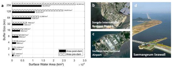 (a) Surface water change due to human barriers (i.e., estuarine dams, seawalls, submerged weirs, etc.) for all buffer sizes. Numbers show surface water area pre- and post-dam. Anthropogenic structures caused a decrease in estuarine surface area of approximately 709.1–16,364.0 km2 or 24–56% between 1984 and 2021. (b) Image of Songdo International Business District, a master-planned city located on 1500 acres of reclaimed land (https://scihub.copernicus.eu/dhus/, accessed on 1 March 2023). (c) The construction of Incheon International Airport [51] resulted in the construction of 17.28 km long dikes and more than 1000 ha of reclaimed land [58] (https://scihub.copernicus.eu/dhus/, accessed on 1 March 2023). (d) Image of Saemangeum Seawall, the world’s longest seawall (https://earth.esa.int/web/earth-watching/image-of-the-week/content/-/article/saemangeum-south-korea/index.html, accessed on 1 March 2023).