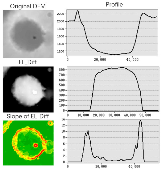 Figure 2 shows the two methods of data processing. In the first method, the slope of slope was calculated from the original DEM using the slope twice. In the second method, the slope of EL_Diff was calculated. First, the impact craters were filled. Second, the filled DEM was subtracted from the original DEM. Third, the slope of the results of the second step was calculated. The slope of EL_Diff highlighted the boundaries of impact craters (red parts in Figure 2) and reduced the stripe noise in the DEM data compared with that using the slope of slope, as shown in Figure 2. In Figure 3, the boundary of the crater was highlighted by “Slope of EL_Diff” in the profile view and compared with the original DEM. Additionally, the spatial resolution, geographic coverage, and map projection of the slope of EL_Diff are the same as those of the DEM, as shown in Table 2.