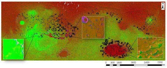 Fusion data are often used to detect impact craters [30,36] rather than relying on a single data source. As shown in Figure 1, the proposed BDMCI framework used fusion data integrated from optical images, DEM data, and slopes of EL_Diff. The optical images are Mars global mosaic images [46] obtained from THEMIS Day IR. The Thermal Emission Imaging System (THEMIS) is an instrument on board the Mars Odyssey spacecraft. The spatial resolution is 100 m per pixel. The geographic coverage of each optical image is 65°S–65°N, 0°E–360°E.