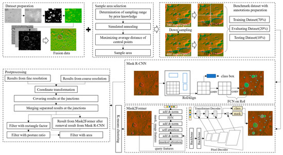 An overview of the proposed BDMCI framework is shown in Figure 6. In the dataset preparation stage, the DEM, optical image, and slope of EL_Diff (as stated in Section 2.2) were integrated into the fusion data. The fusion data contain elevation, grayscale information, and the highlighted boundaries of terrain. In the sample area selection stage (Section 2.3), the sampling range was determined based on prior knowledge. The sample area was selected using simulated annealing and maximizing the average distance from central points. After data preparation and sample area selection, the benchmark dataset with multiscale images and annotations was input into Mask R-CNN and Mask2Former. The results from Mask2Former were processed by K-means clustering and then merged with the results from Mask R-CNN. Finally, the merged results were postprocessed to identify the fractures at junctions and filter out the false results. This framework can be used to identify accurate boundaries of Martian impact craters with geographic information and deep learning. The impact craters between 65°S–65°N, 0°E–360°E were identified using this framework, as discussed in Section 4.6.