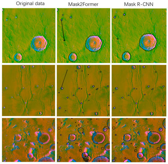 Figure 7 depicts the detection results obtained with Mask2Former and Mask R-CNN. In the second column of Figure 7, while detecting more small craters than Mask R-CNN, Mask2Former also brings many negative effects (the results that were associated with the same crater) due to an insufficient benchmark dataset. In the third column of Figure 7, while Mask-RCNN missed some small craters, it could avoid the excessive influence of tiny terrain compared with Mask2Former. After the experiments in Section 4, we found that the method “Mask R-CNN + Mask2former” performed the best. Finally, “Mask R-CNN + Mask2former” was constructed to identify impact craters with a large geographic extent.