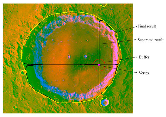 After covering the separate results at the junctions by calculating split lines, several separate results remained. For the results near the vertices of the patches, the associated identifiers were modified by obtaining the buffers of vertices, as shown in Figure 9. Thus, the identifiers of the same impact crater were set to the same number. For the results on the edges of patches, the associated identifiers were modified manually, as shown in Figure 10. Then, the corresponding convex hull was calculated to merge the separate results into a complete crater.